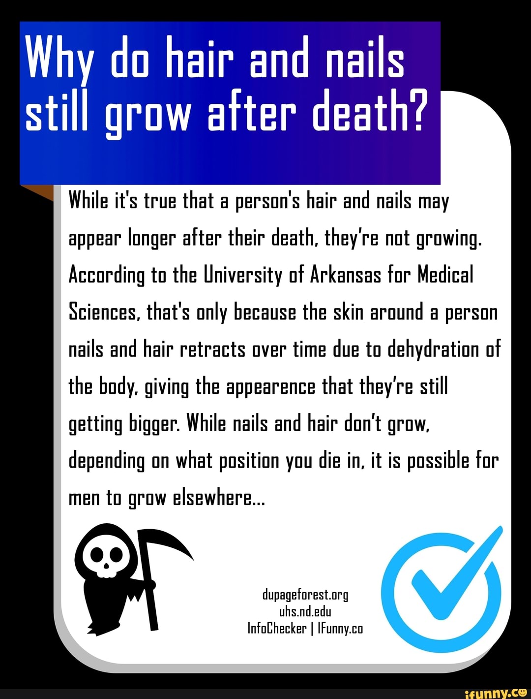 Well its probably true that your most petty friends will criticize your hair and nails even in death but it is not true that your hair and nails continue to grow after you die. Instead a persons fingernails and hair may appear longer because the skin around them has retracted according to the Dermatology Clinic at UAMS.